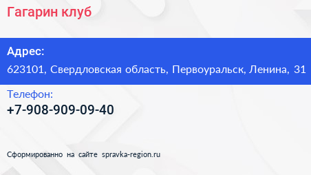 Гагарин клуб по адресу 623101, Свердловская область, Первоуральск, Ленина, 31 в дальнейшем Организация, размещена в следующих категориях:
