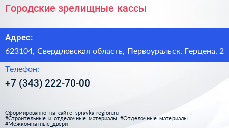 Городские зрелищные кассы по адресу 623104, Свердловская область, Первоуральск, Герцена, 2 в дальнейшем Организация, размещена в следующих категориях: