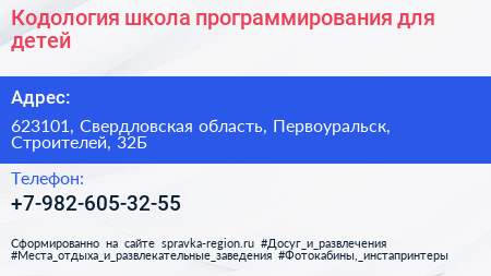 Кодология, школа программирования для детей по адресу 623101, Свердловская область, Первоуральск, Строителей, 32Б в дальнейшем Организация, размещена в следующих категориях: