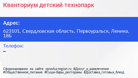 Кванториум, детский технопарк по адресу 623101, Свердловская область, Первоуральск, Ленина, 18Б в дальнейшем Организация, размещена в следующих категориях: