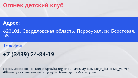 Огонек, детский клуб по адресу 623101, Свердловская область, Первоуральск, Береговая, 58 в дальнейшем Организация, размещена в следующих категориях:
