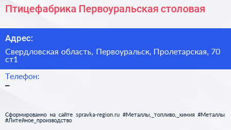 Птицефабрика Первоуральская, столовая по адресу Свердловская область, Первоуральск, Пролетарская, 70 ст1 в дальнейшем Организация, размещена в следующих категориях: