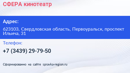 СФЕРА, кинотеатр по адресу 623103, Свердловская область, Первоуральск, проспект Ильича, 31 в дальнейшем Организация, размещена в следующих категориях: