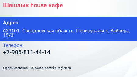 Шашлык house, кафе по адресу 623101, Свердловская область, Первоуральск, Вайнера, 15/3 в дальнейшем Организация, размещена в следующих категориях: