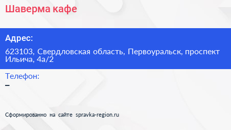 #Шаверма, кафе по адресу 623103, Свердловская область, Первоуральск, проспект Ильича, 4а/2 в дальнейшем Организация, размещена в следующих категориях: