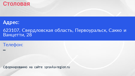 Столовая по адресу 623107, Свердловская область, Первоуральск, Сакко и Ванцетти, 28 в дальнейшем Организация, размещена в следующих категориях: