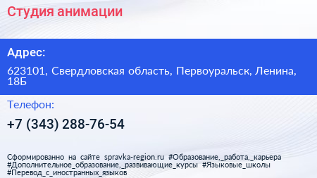 Студия анимации по адресу 623101, Свердловская область, Первоуральск, Ленина, 18Б в дальнейшем Организация, размещена в следующих категориях: