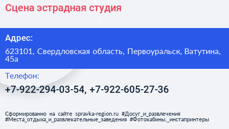 Сцена, эстрадная студия по адресу 623101, Свердловская область, Первоуральск, Ватутина, 45а в дальнейшем Организация, размещена в следующих категориях:
