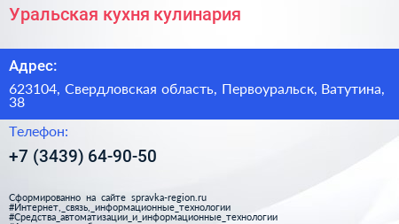 Уральская кухня, кулинария по адресу 623104, Свердловская область, Первоуральск, Ватутина, 38 в дальнейшем Организация, размещена в следующих категориях:
