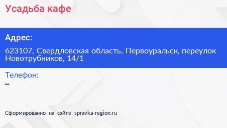 Усадьба, кафе по адресу 623107, Свердловская область, Первоуральск, переулок Новотрубников, 14/1 в дальнейшем Организация, размещена в следующих категориях: