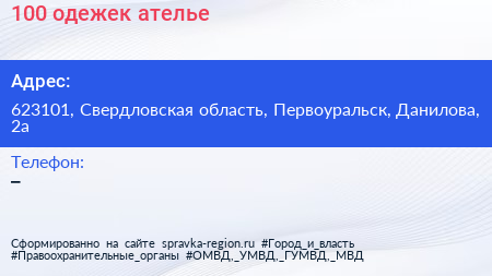 100 одежек, ателье по адресу 623101, Свердловская область, Первоуральск, Данилова, 2а в дальнейшем Организация, размещена в следующих категориях: