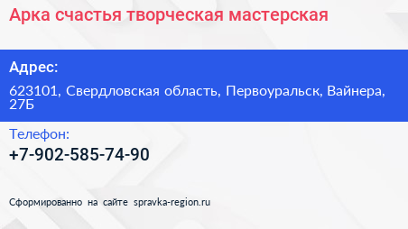 Арка счастья, творческая мастерская по адресу 623101, Свердловская область, Первоуральск, Вайнера, 27Б в дальнейшем Организация, размещена в следующих категориях: