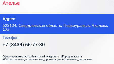 Ателье по адресу 623104, Свердловская область, Первоуральск, Чкалова, 19а в дальнейшем Организация, размещена в следующих категориях:
