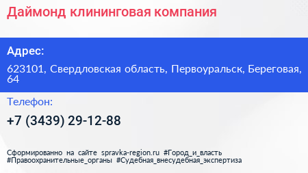 Даймонд, клининговая компания по адресу 623101, Свердловская область, Первоуральск, Береговая, 64 в дальнейшем Организация, размещена в следующих категориях: