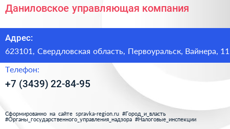 Даниловское, управляющая компания по адресу 623101, Свердловская область, Первоуральск, Вайнера, 11 в дальнейшем Организация, размещена в следующих категориях: