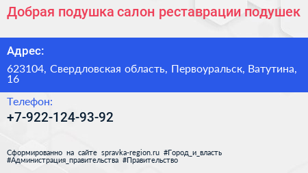 Добрая подушка, салон реставрации подушек по адресу 623104, Свердловская область, Первоуральск, Ватутина, 16 в дальнейшем Организация, размещена в следующих категориях: