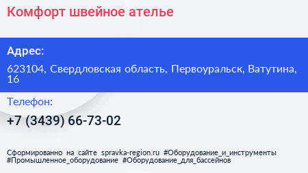 Комфорт, швейное ателье по адресу 623104, Свердловская область, Первоуральск, Ватутина, 16 в дальнейшем Организация, размещена в следующих категориях: