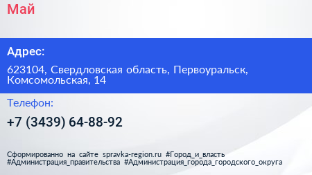 Май по адресу 623104, Свердловская область, Первоуральск, Комсомольская, 14 в дальнейшем Организация, размещена в следующих категориях: