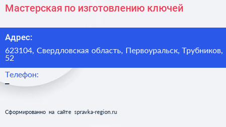 Мастерская по изготовлению ключей по адресу 623104, Свердловская область, Первоуральск, Трубников, 52 в дальнейшем Организация, размещена в следующих категориях: