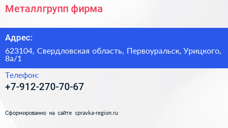 Металлгрупп, фирма по адресу 623104, Свердловская область, Первоуральск, Урицкого, 8а/1 в дальнейшем Организация, размещена в следующих категориях: