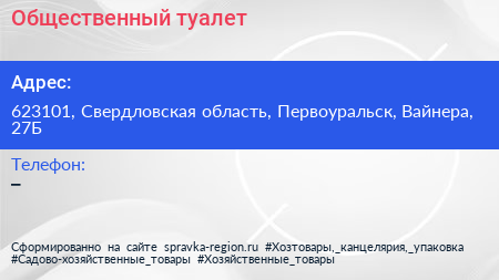 Общественный туалет по адресу 623101, Свердловская область, Первоуральск, Вайнера, 27Б в дальнейшем Организация, размещена в следующих категориях: