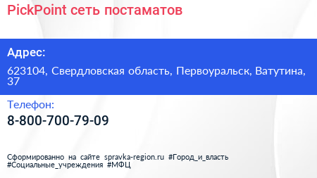 PickPoint, сеть постаматов по адресу 623104, Свердловская область, Первоуральск, Ватутина, 37 в дальнейшем Организация, размещена в следующих категориях: