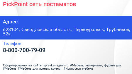 PickPoint, сеть постаматов по адресу 623104, Свердловская область, Первоуральск, Трубников, 52а в дальнейшем Организация, размещена в следующих категориях: