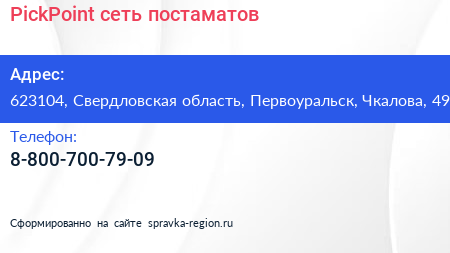 PickPoint, сеть постаматов по адресу 623104, Свердловская область, Первоуральск, Чкалова, 49 в дальнейшем Организация, размещена в следующих категориях: