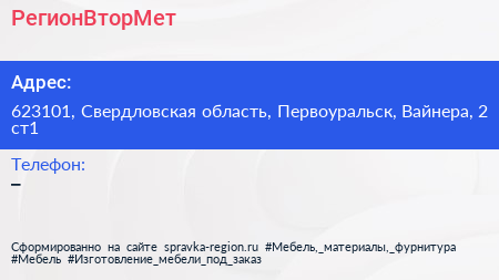 РегионВторМет по адресу 623101, Свердловская область, Первоуральск, Вайнера, 2 ст1 в дальнейшем Организация, размещена в следующих категориях: