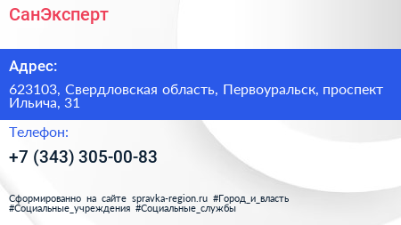 СанЭксперт по адресу 623103, Свердловская область, Первоуральск, проспект Ильича, 31 в дальнейшем Организация, размещена в следующих категориях: