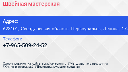 Швейная мастерская по адресу 623101, Свердловская область, Первоуральск, Ленина, 17а в дальнейшем Организация, размещена в следующих категориях: