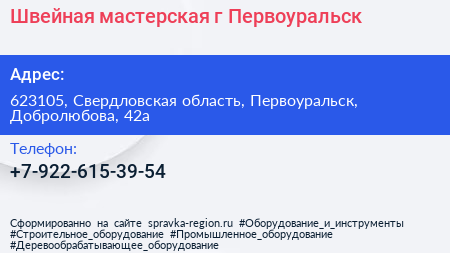 Швейная мастерская, г. Первоуральск по адресу 623105, Свердловская область, Первоуральск, Добролюбова, 42а в дальнейшем Организация, размещена в следующих категориях: