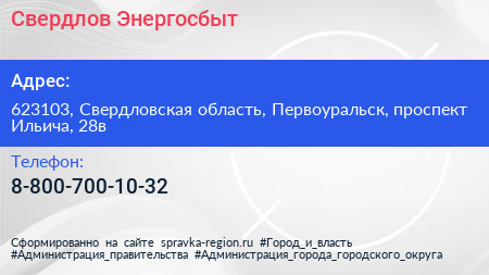 Свердлов Энергосбыт по адресу 623103, Свердловская область, Первоуральск, проспект Ильича, 28в в дальнейшем Организация, размещена в следующих категориях: