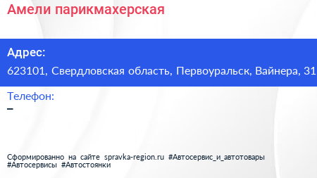 Амели, парикмахерская по адресу 623101, Свердловская область, Первоуральск, Вайнера, 31 в дальнейшем Организация, размещена в следующих категориях: