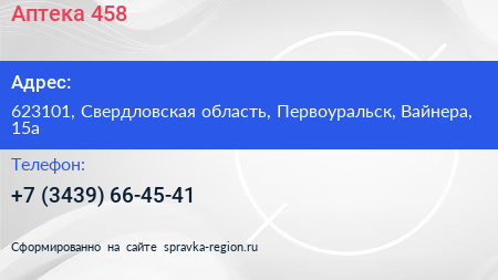 Аптека №458 по адресу 623101, Свердловская область, Первоуральск, Вайнера, 15а в дальнейшем Организация, размещена в следующих категориях: