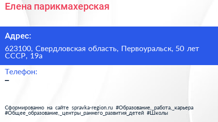Елена, парикмахерская по адресу 623100, Свердловская область, Первоуральск, 50 лет СССР, 19а в дальнейшем Организация, размещена в следующих категориях: