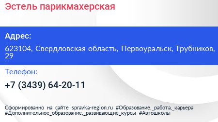 Эстель, парикмахерская по адресу 623104, Свердловская область, Первоуральск, Трубников, 29 в дальнейшем Организация, размещена в следующих категориях: