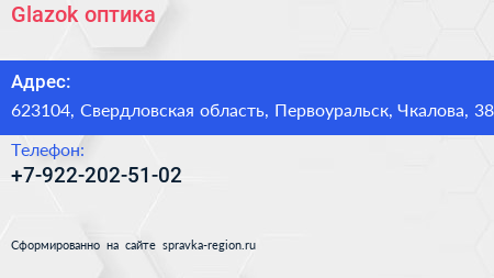 Glazok, оптика по адресу 623104, Свердловская область, Первоуральск, Чкалова, 38 в дальнейшем Организация, размещена в следующих категориях: