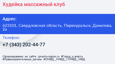 Худейка, массажный клуб по адресу 623101, Свердловская область, Первоуральск, Данилова, 2а в дальнейшем Организация, размещена в следующих категориях: