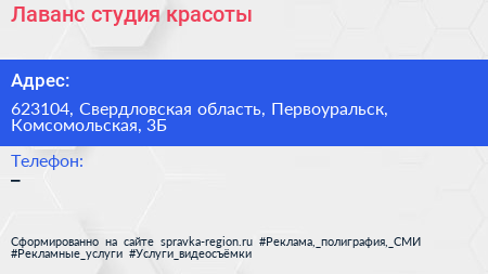 Лаванс, студия красоты по адресу 623104, Свердловская область, Первоуральск, Комсомольская, 3Б в дальнейшем Организация, размещена в следующих категориях: