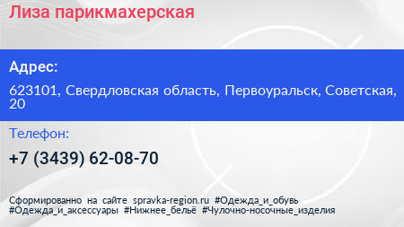 Лиза, парикмахерская по адресу 623101, Свердловская область, Первоуральск, Советская, 20 в дальнейшем Организация, размещена в следующих категориях: