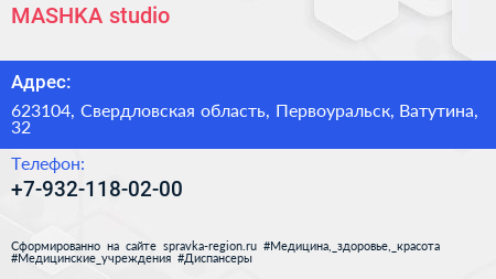 MASHKA studio по адресу 623104, Свердловская область, Первоуральск, Ватутина, 32 в дальнейшем Организация, размещена в следующих категориях: