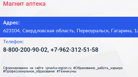 Магнит, аптека по адресу 623104, Свердловская область, Первоуральск, Гагарина, 1а в дальнейшем Организация, размещена в следующих категориях: