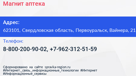 Магнит, аптека по адресу 623101, Свердловская область, Первоуральск, Вайнера, 21 в дальнейшем Организация, размещена в следующих категориях: