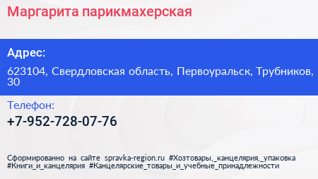 Маргарита, парикмахерская по адресу 623104, Свердловская область, Первоуральск, Трубников, 30 в дальнейшем Организация, размещена в следующих категориях: