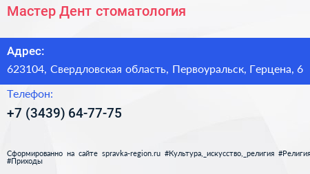 Мастер-Дент, стоматология по адресу 623104, Свердловская область, Первоуральск, Герцена, 6 в дальнейшем Организация, размещена в следующих категориях: