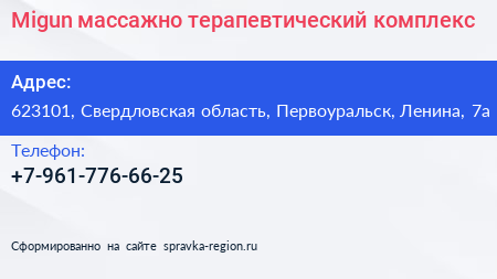 Migun, массажно-терапевтический комплекс по адресу 623101, Свердловская область, Первоуральск, Ленина, 7а в дальнейшем Организация, размещена в следующих категориях: