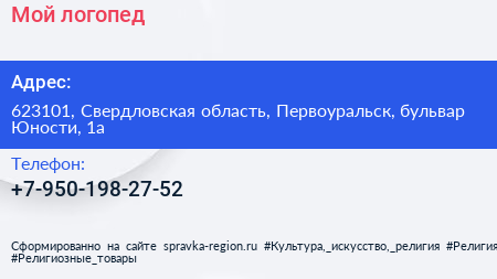 Мой логопед по адресу 623101, Свердловская область, Первоуральск, бульвар Юности, 1а в дальнейшем Организация, размещена в следующих категориях: