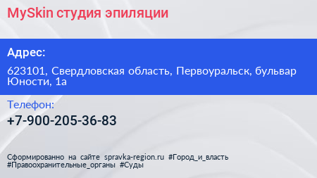 MySkin, студия эпиляции по адресу 623101, Свердловская область, Первоуральск, бульвар Юности, 1а в дальнейшем Организация, размещена в следующих категориях: