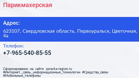 Парикмахерская по адресу 623107, Свердловская область, Первоуральск, Цветочная, 4а в дальнейшем Организация, размещена в следующих категориях:
